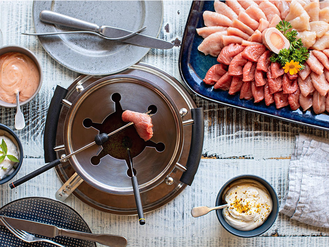 Zartes handgeschnittenes Fleisch vom Kalbsnierstück, Rindsfilet, Pouletbrust und Lammnierstück (NZ), feine Saucen, verschiedene Mixed Pickles und würzige Bouillon – alles frisch vorbereitet und am Tisch selbst gegart.